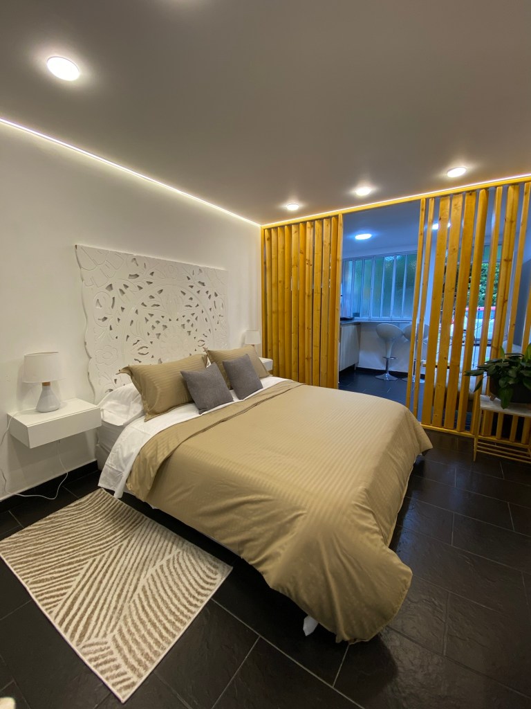 Moderno apartaestudio de 32m2, de tres ambientes, cuenta con cama queen, smart TV, amplio vestier, baño, y cocina completamente equipada. También con zona de ropas con lavadora y secadora por un precio adicional.