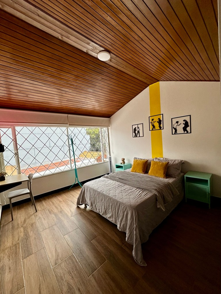 Habitación completamente amoblada, con cama doble, supremamente cómoda; con decoración jovial, 2 mesas de noches, muy iluminada con amplios ventanales, con escritorio, Smart TV 📺, cuenta con baño privado amplio, cuenta con dos amplios closet (uno en la habitación y otro en el baño) la habitación esta ubicada en el segundo piso de la casa.