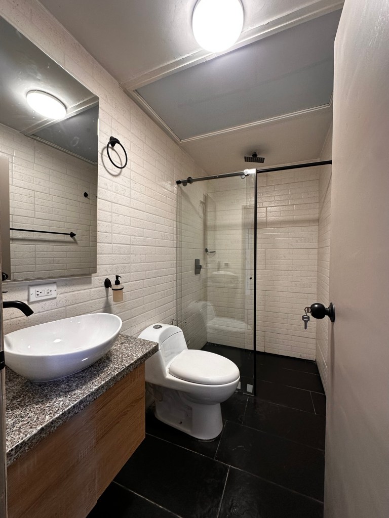 Hermosa habitación con cama doble, amplio clóset y baño compartido, muy iluminada con amplios ventanales hacia la calle, cuenta con smart TV y escritorio.
