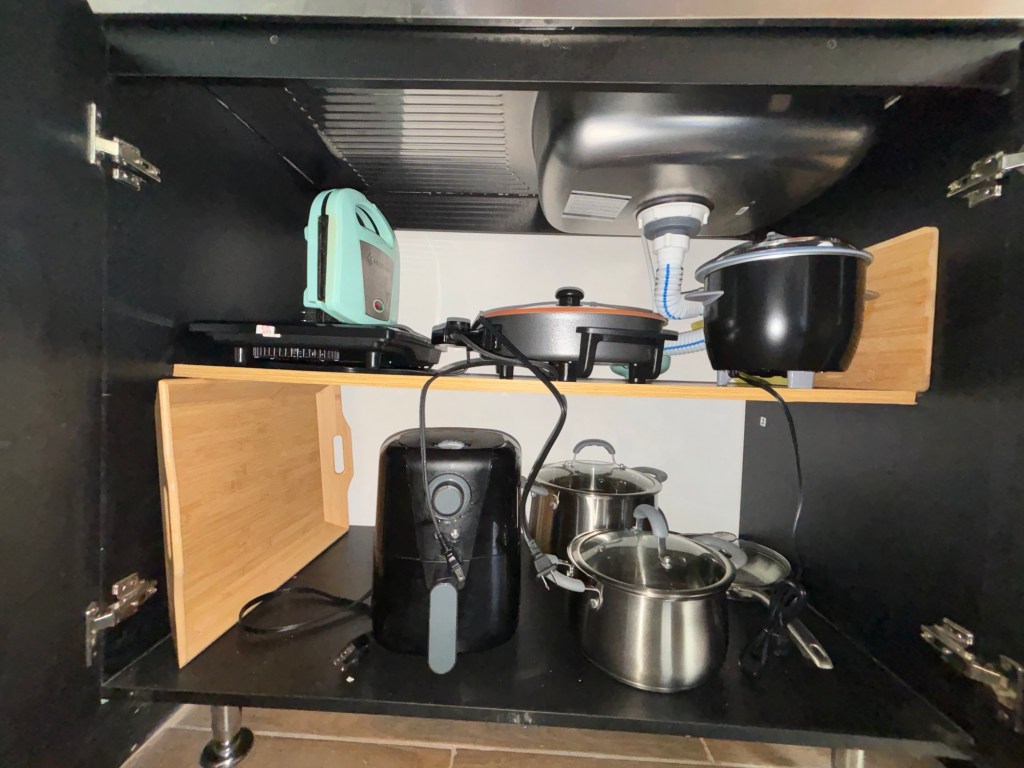 Cama queen, con mesa de noche y lámpara de lectura.Sala de estar, con TV smarTV marca Samsung de 58 pulgadas, closet. Sala de estar, con TV smarTV marca Samsung de 58 pulgadas, closet, puerta hacia el baño, puerta de salida de la habitación. Baño privado.Baño completo, con ducha cabinada, agua caliente.Cocina, con mueble superior e inferior, minibar, horno microondas, barra y 2 sillas de barra. Espacio suficiente para aguardar alimentos.Equipamiento de la cocina. Equipamiento de la cocina, fogón de inducción 1 puesto, olla arrocera, Sanduchera, airfryer, sartén eléctrico, tablas para picar, 2 ollas y 1 sartén para fogón de inducción.Escritorio y silla ergonómica.Room tour here⬆️